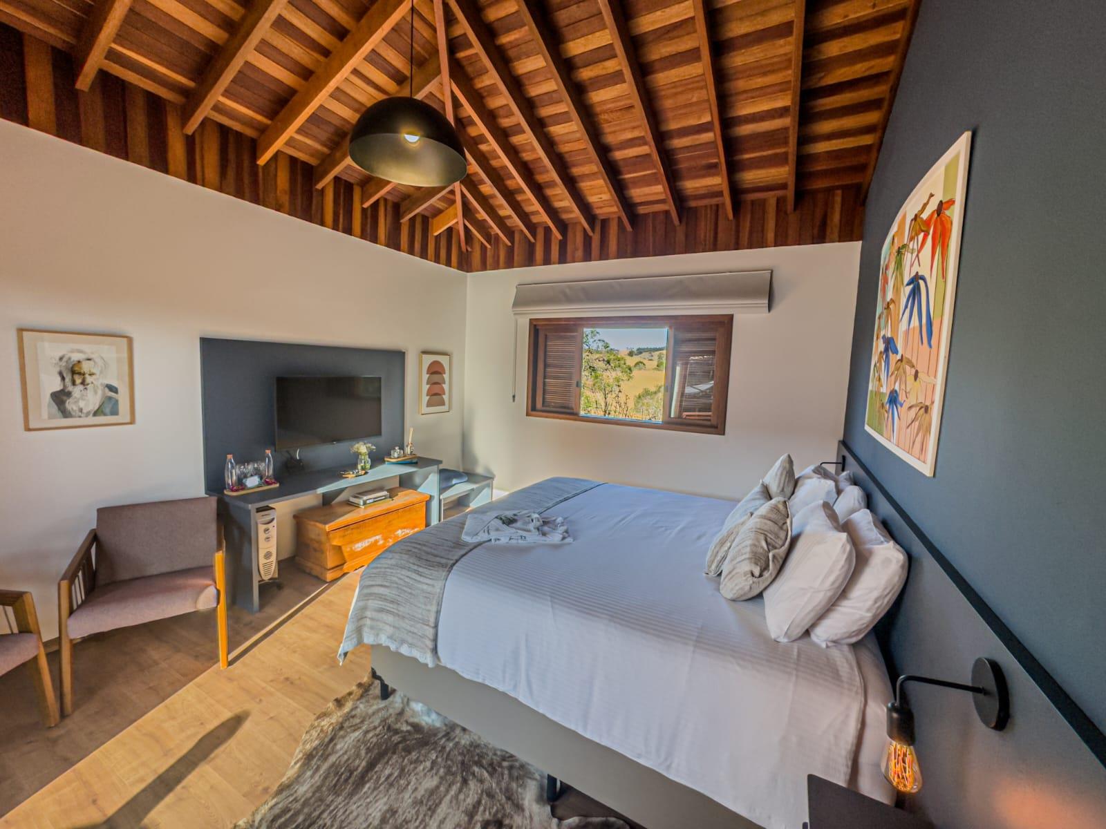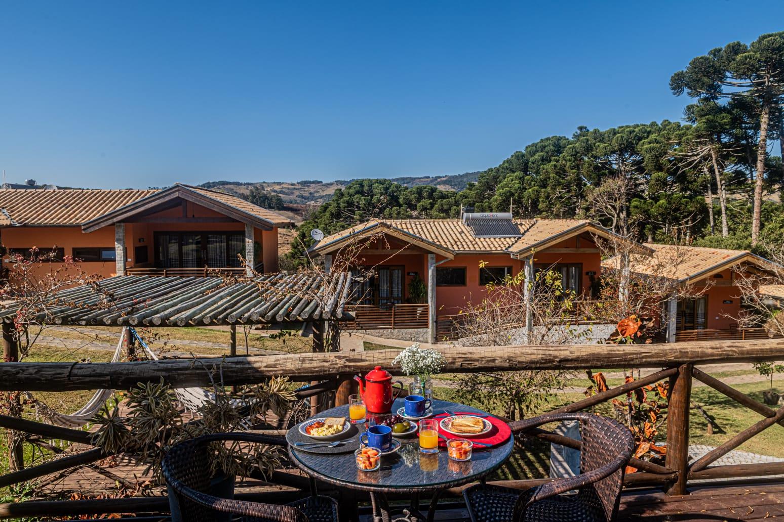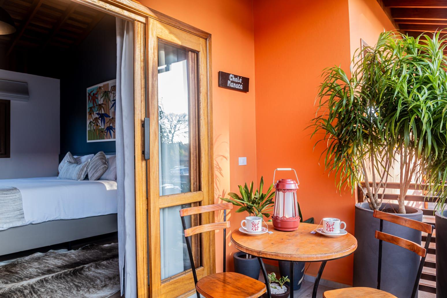 Os chalés possuem ambientes amplos e bem distribuídos, banheiros privativos, mini cozinha totalmente equipada, varanda privativa e um espaço pensado tanto para descansar quanto para trabalhar com tranquilidade, ideal para quem busca equilíbrio entre lazer e produtividade.