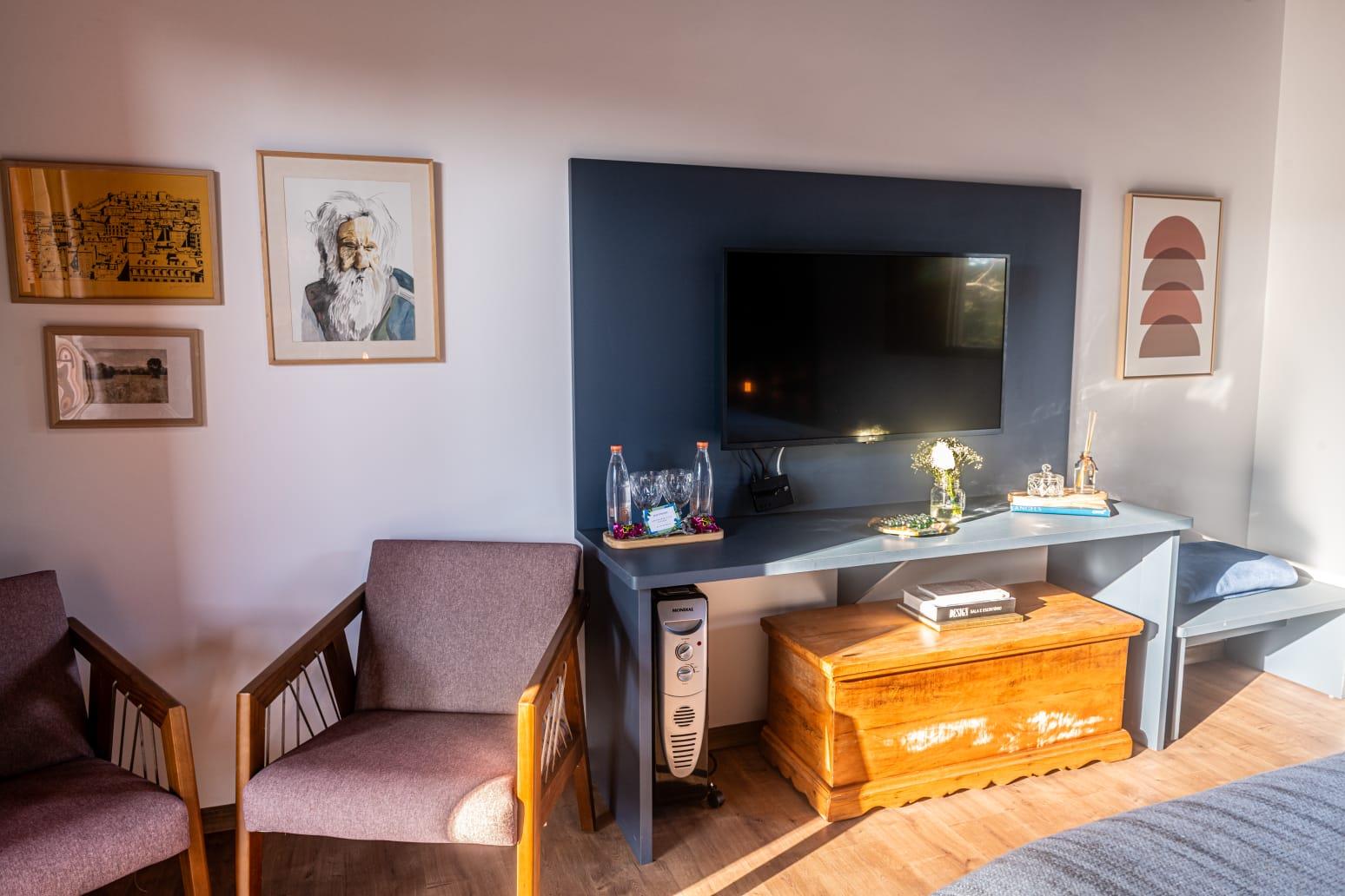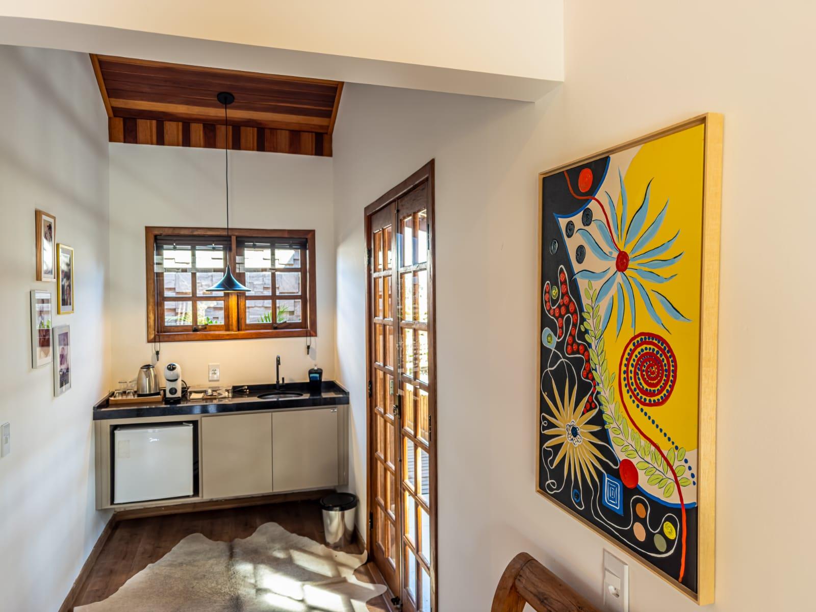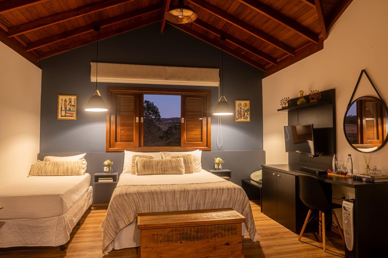 Os chalés possuem ambientes amplos e bem distribuídos, banheiros privativos, mini cozinha totalmente equipada, varanda privativa e um espaço pensado tanto para descansar quanto para trabalhar com tranquilidade, ideal para quem busca equilíbrio entre lazer e produtividade.